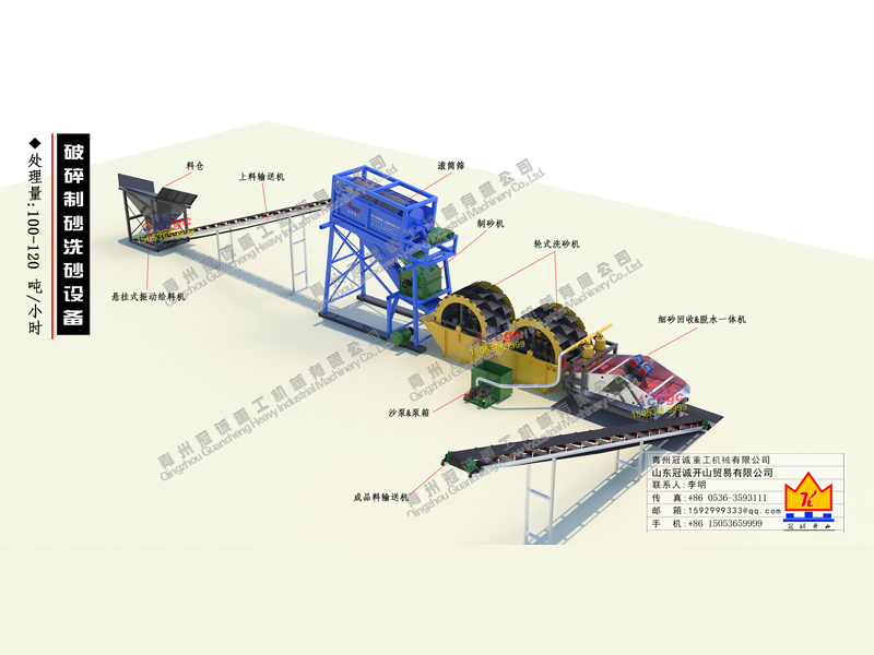 原料通過工程車輛送入進料倉,由進料倉底部的振動給料機均勻給料進入一台颚式破碎機内進行粗破,破碎後的物料與振動給料機篩分出的細料一同由輸送機送入滾筒篩内進行篩選分級爲粗料與細料兩種規格;細料直接通過溜槽排入洗砂機内,粗料進入制砂機進行破碎制砂,然後由一台沙泵打入洗砂機内。